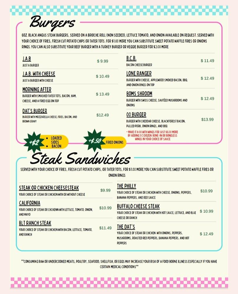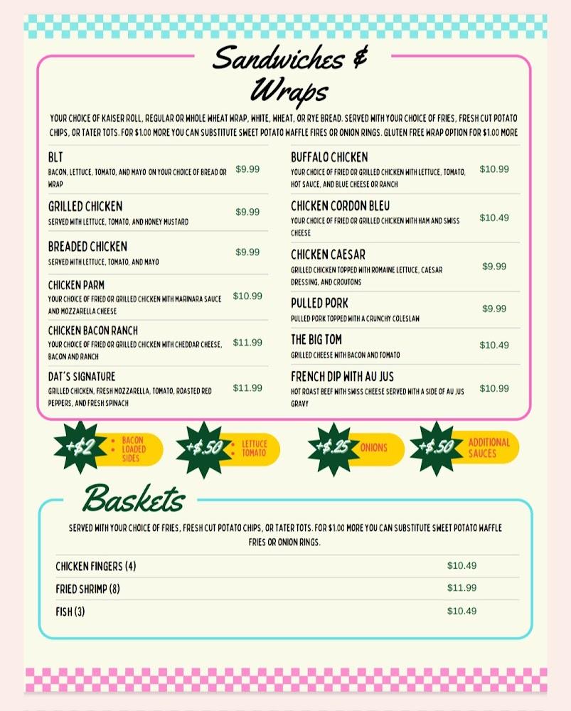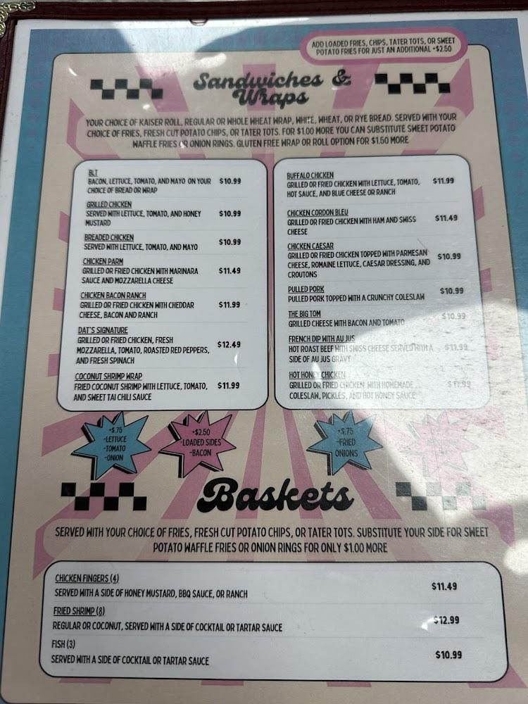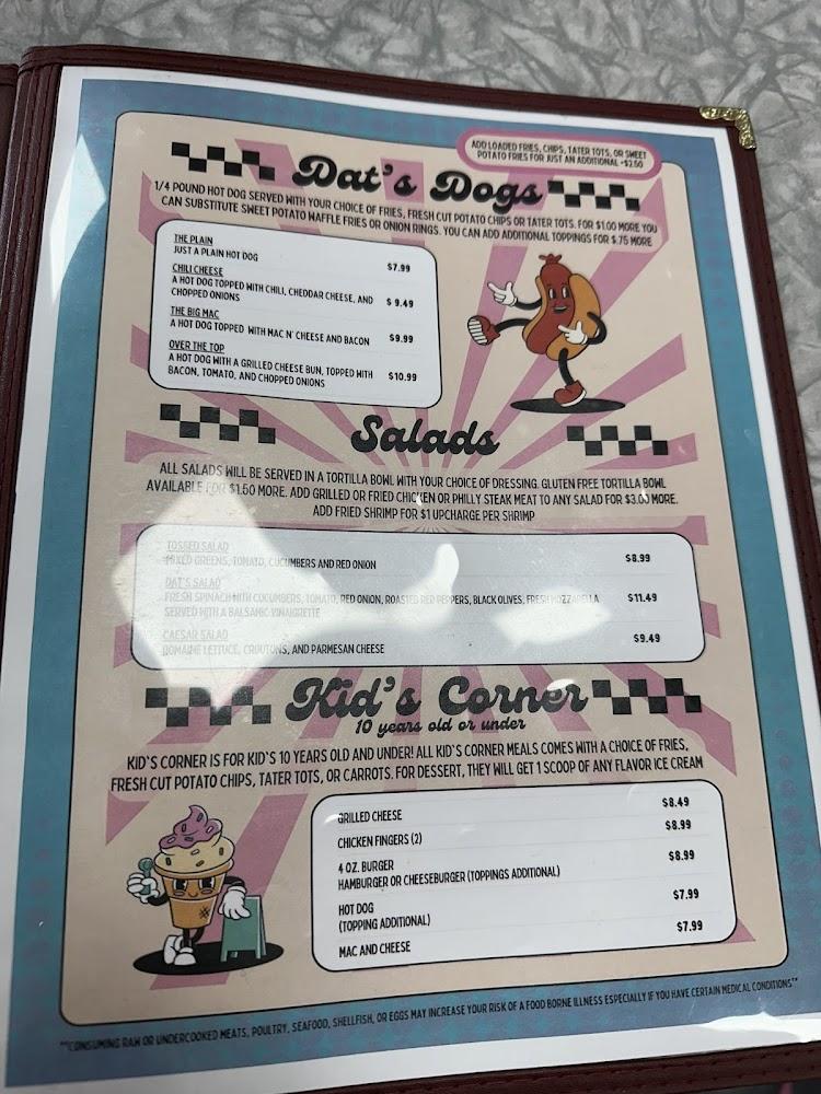 The menu caters to a variety of tastes, featuring items like classic burgers, sandwiches, and salads. Loaded tots and mac and cheese sticks are perfect for sharing. Kids can enjoy options like grilled cheese and chicken fingers from the Kid’s Corner. DAT’s specializes in homemade ice cream, with soft serve and gelato options. The dessert menu tantalizes with choices like crumb cake and brownies. Patrons appreciate the simplicity of traditional fare. The diverse menu allows for quick bites or leisurely meals. Celebrate with friends or grab a treat solo, DAT's has you covered. There is something delightful for everyone, making it a delightful experience overall.